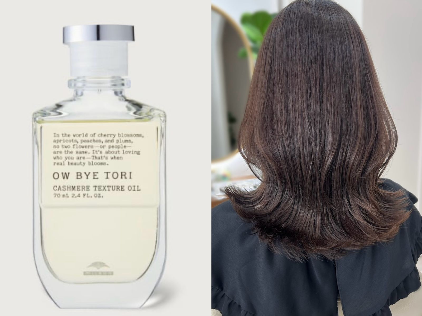 カシミアテクスチュアオイル〈ヘアオイル・ハンドオイル〉70ml 4,400円税込…パサつきやすい方、ハイトーンデザインの方におすすめ!うるおいとツヤ感アップ。くびれ巻きにも相性抜群◎(お客さまヘアスタイル/TheC otakanomari stylist滑川)